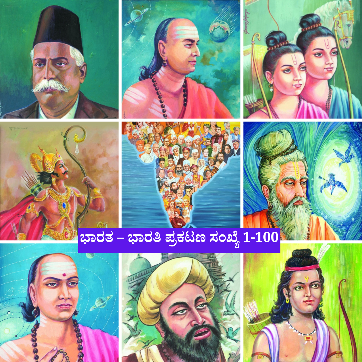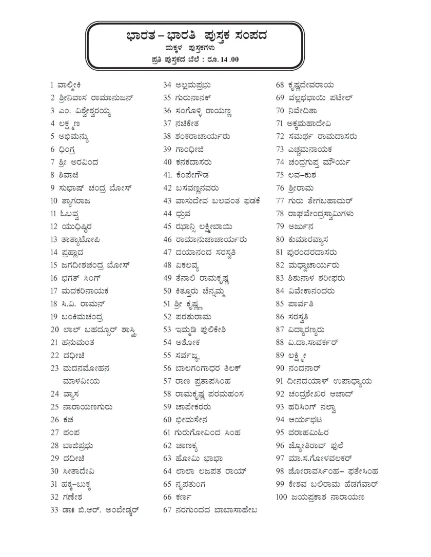The Bharata-Bharati Kannada Series (1–100), which introduces the life stories of 100 great achievers of India, is now available. This collection includes biographies of renowned personalities from various fields such as history, culture, literature, and the freedom struggle, including figures like Valmiki, Abhimanyu, Bankim Chandra, and Madakari Nayaka.